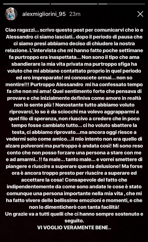 Sembra dunque che l’ex corteggiatore non sia più innamorato e che quel sentimento che si era acceso sotto la luce dei riflettori si è piano piano spento, e trasformato in qualcos’altro. Ecco cosa ha scritto Alex: