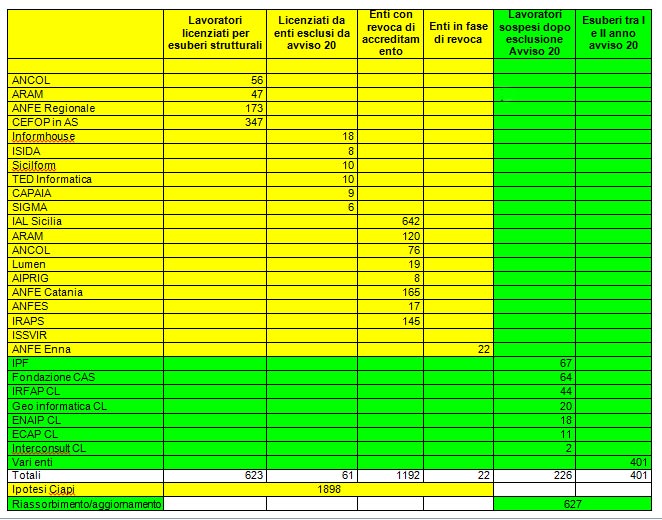 Oltre 2500 gli esuberi nella Formazione professionale (2525 in tutto), la crisi del settore assume contorni sempre più drammatici, e a questi numeri bisogna aggiungere i 1.780 lavoratori degli Sportelli multifunzionali, per i quali è stata trovata una soluzione tampone per soli 6 mesi con l’affidamento del servizio in house providing al Ciapi di Priolo, e la crisi della filiera dell’obbligo (circa 1.800 operatori coinvolti), che non percepiscono la retribuzione da circa 20 mesi e che non hanno, ancora ad oggi, certezze sull’avvio delle attività.