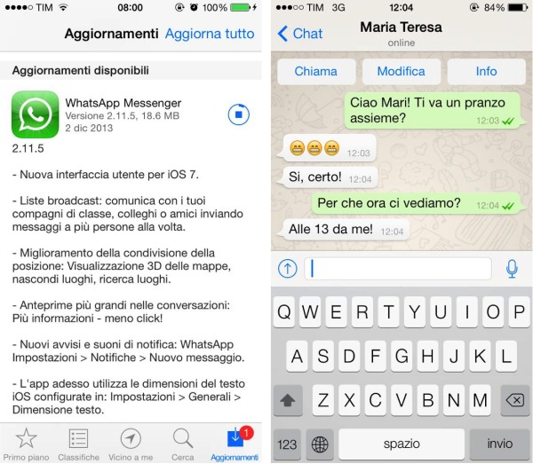 Per scaricare la nuova versione, basterà andare nella sezione Aggiornamenti dell’App Store (l’ultima tab in basso a destra) e pressare sul tasto Aggiorna di fianco a Whatsapp.