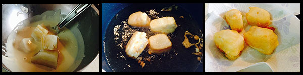 Consigli: la pastella deve essere molto fredda, una volta tirata fuori dal frigorifero mettete il contenitore della pastella a bagno con acqua e ghiaccio in modo che rimanga fredda. I contrasto con l’olio bollente è ottimale per la riuscita di un perfetto fritto croccante.