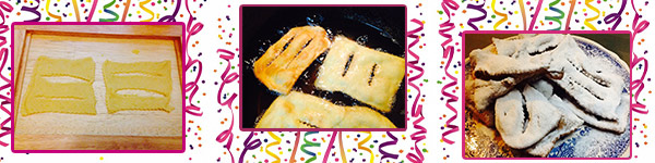Ponete le strisce così ottenute in abbondante olio ben caldo ma non bollente a 170 gradi, girandole su ambo i lati , devono dorare e gonfiare, sgocciolare su carta assorbente. Appena fredde cospargetele di zucchero al velo vanigliato.