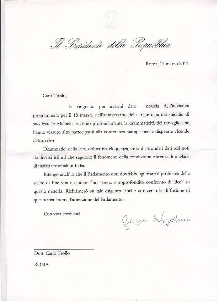 “Drammatici – prosegue il Capo dello Stato – nella loro obiettiva eloquenza sono d’altronde i dati resi noti da diversi istituti che seguono il fenomeno della condizione estrema di migliaia di malati in Italia. Sento profondamente – conclude Napolitano – la drammaticità del travaglio che hanno vissuto altri partecipanti alla conferenza stampa per le disperate vicende di loro cari”.