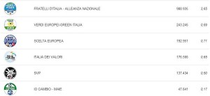 0.47 Percentuali che si sono stabilizzate ormai quando sono state scrutinate 54.191 su 61.592 con il Pd al 41,43%, M5S al 20,86%, Forza Italia al 16,39%, Lega Nord al 6,42%, Ncd-Udc 4,30%, L’altra Europa con Tsipras 4,06%, Fratelli d’Italia al 3,56%, Verdi europei-Green Italia allo 0,89%, Scelta europea allo 0,69%, Italia dei valori allo 0,61%, Svp allo 0,56%, Io cambio-Maie allo 0,17%.
