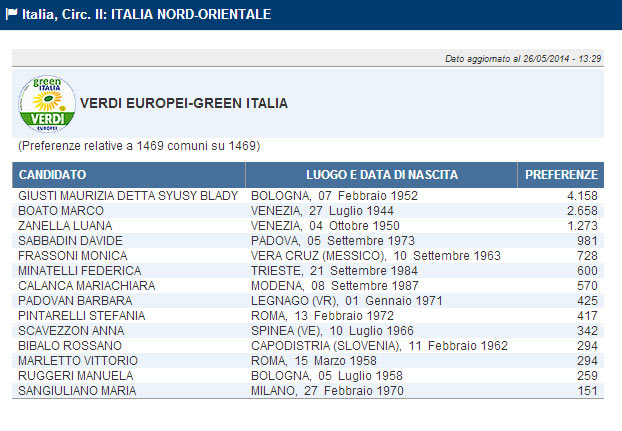 Europee 2014, ecco tutte le preferenze, candidato per candidato, dei Verdi Europei – Green Italia nella circoscrizione Nord Est.