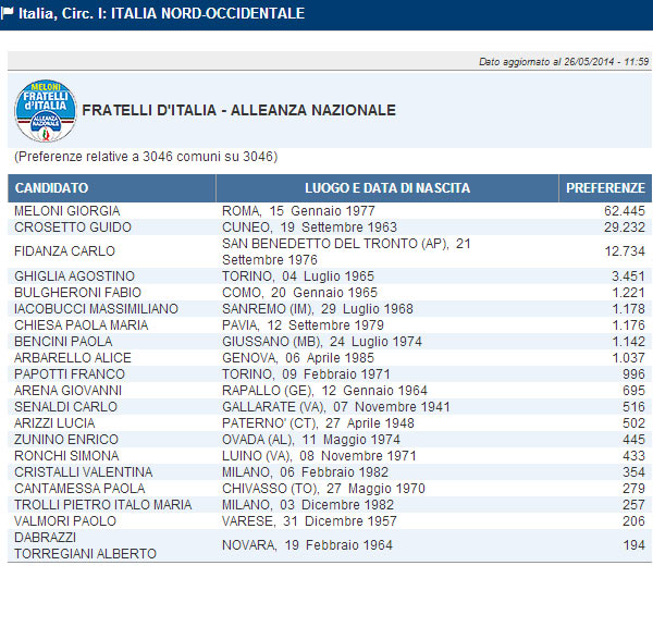 Europee 2014, ecco tutte le preferenze, candidato per candidato, di Fratelli d’Italia nella circoscrizione Nord Ovest.