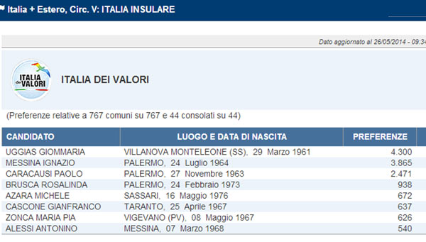 Europee 2014, ecco tutte le preferenze, candidato per candidato, di Italia dei Valori nella circoscrizione Isole.