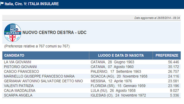Europee 2014, ecco tutte le preferenze, candidato per candidato, di Nuovo centrodestra – Udc nella circoscrizione Isole.