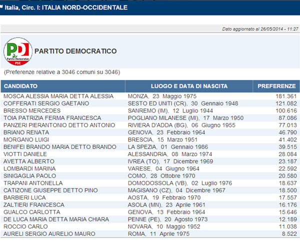 Europee 2014, ecco tutte le preferenze, candidato per candidato, del Partito Democratico nella circoscrizione Nord Ovest.