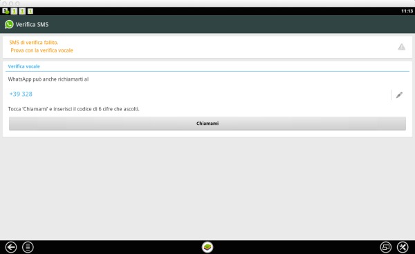 - Aprire WhatsApp e procedere con la procedura di configurazione in cui chiede di inserire il numero di telefono. La verifica tramite sms non funziona, dunque aspettare che “fallisca” il tentativo e pressare su “Chiamami” per effettuare la provare con verifica vocale.