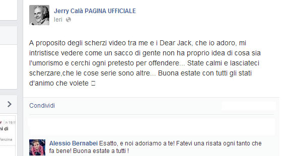 La risposta di Jerry è stata “Dear Jack grandissimi vi voglio bene con tutti gli stati d’animo!”. Insomma pace subito fatta, grazie a due risate. Ma i commenti degli utenti dei social network sono stati, come spesso accade, pesanti. Da una parte c’è stato chi ha accusato la giovane band di offendere una icona degli anni ’80, dall’altro le fan di Alessio e i Dear Jack si sono scatenate e la cosa più carina (e pubblicabile) che hanno scritto a Calà è stata di andare in pensione.