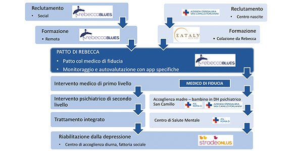 Il social network Rebecca Blues (basato su piattaforma mobile in modo da raggiungere il maggior numero di persone possibili) permette da un lato l’autodiagnosi delle mamme e dall’altro l’attivazione del medico in caso di necessità. Questa particolare strategia è stata chiamata “Patto di Rebecca” ed è il nucleo centrale del software. La piattaforma Rebecca Blues è anche pensata per fornire servizi di formazione attraverso filmati (Youtube) alla mamma, alla famiglia, al partner, ma anche ai professionisti che aderiranno al progetto.