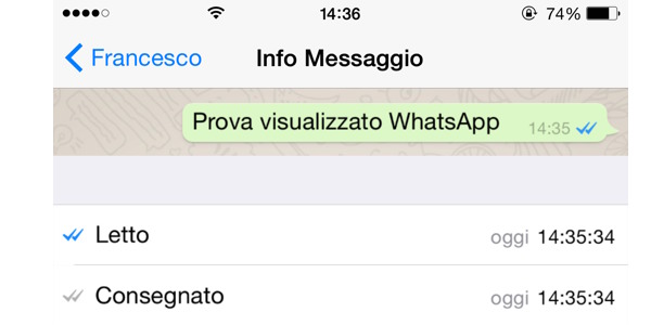 Inoltre, tenendo premuto su ogni singolo messaggio verrà visualizzata la voce “Info”, che permette di vedere nel dettaglio l’orario di lettura e di consegna.