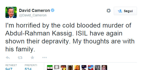 Si è detto inorridito per l’uccisione “a sangue freddo” di Kassig anche il premier inglese David Cameron, mentre il presidente francese Francois Hollande ha parlato di “crimini contro l’umanità”.
