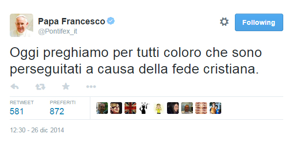 “Oggi preghiamo per tutti coloro che sono perseguitati a causa della fede cristiana”: così il Papa in un nuovo tweet, nel giorno della festa di Santo Stefano.