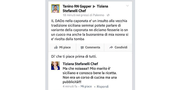 Che noia signona Stefanelli? Lei ha buttato all’aria la tradizione gastronomica siciliana per uno spot e i palermitani dovevano rimanere zitti? Una delle prime a infuriarsi contro la pubblicità è stata la giornalista palermitana Giusina Battaglia: “Se c’è una cosa di cui noi siculi possiamo andare fieri nei secoli – scrive – con petto in fuori e schiena dritta, pavoneggiandoci fino all’eternità, è la nostra cultura gastronomica. E se pensi che la caponata non è un piatto qualsiasi, ma il piatto per eccellenza, non serve certo uno chef di grido o un esperto di cucina per arginare questa sorta di eresia. Il dado nella caponata è come Lucifero in Paradiso. Punto. Siccome non potevo darmi pace (…) ho cominciato a mostrare la mia indignazione alla signora Tiziana Stefanelli Chef (così si chiama sul suo profilo Fb e Twitter). E partendo dal presupposto che una che a fatica si conquista il titolo di chef passando dalla grigia vita forense a quella di regina dei fornelli, le ho scritto garbatamente che avrebbe avuto il dovere/potere di opporsi alla richiesta di una multinazionale che le scrive un copione, immondo, che prevede il dado per fare la caponata. Proprio questo le ho detto. Che doveva tirarsi indietro, che doveva rifiutare quella proposta, che doveva cambiare ricetta. Perché così la sua credibilità, così mi pare, viene irrimediabilmente minata”.