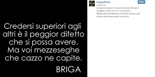 “Tu non sei un artista, sei un allievo. Tu hai bisogno di lavorare su determinate cose e ti ho dato un brano che puoi fare” continua l’insegnante. Briga continua a dire che non lo vuole fare: “Io sto cercando di espandere la mia visione della musica e non vedo perché su Canale 5 mi devo esprimere con un pezzo lontano da me, di un artista che non mi rappresenta. Io mi rifiuto di cantare Celentano, come Ron, come Pupo“.