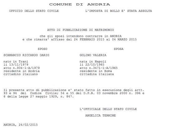 Riccardo Scamarcio e Valeria Golino si sposano dopo quasi 10 anni di relazione: la coppia del cinema italiano convolerà a nozze nel Comune di Andria, città natale di lui, nel cui albo pretorio online sono apparse ieri le pubblicazioni.