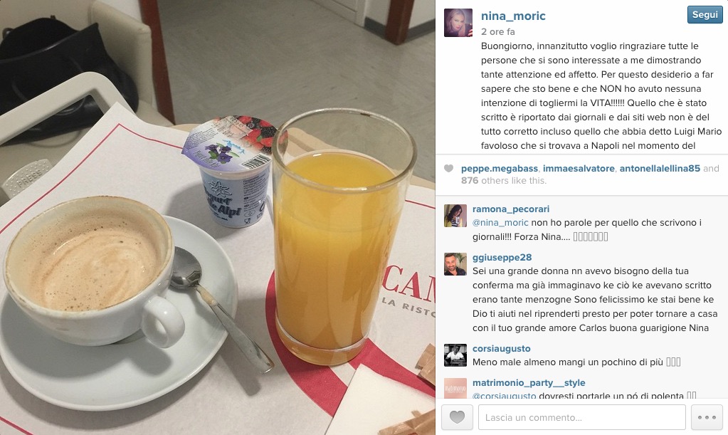 Nina Moric smentisce la notizia relativa al suo tentato suicidio, pubblicando una foto su Instagram in cui spiega che in realtà era caduta e dunque trasportata in ospedale: “Sabato sera sono stata portata in ospedale a causa di un incidente domestico (sono caduta sbattendo la testa e mi sono fatta male ovunque a causa di un abbassamento di pressione). Lo testimonia anche il fatto che sono entrata in pronto soccorso come codice verde!”.