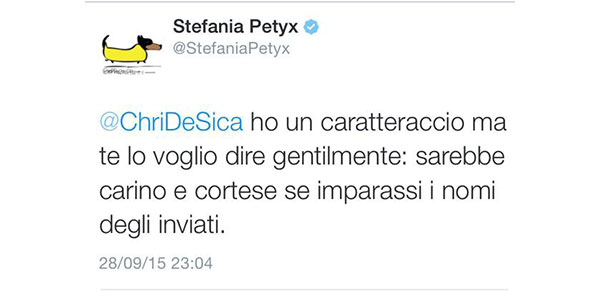 Infatti, quando la Hunziker ha annunciato il servizio dell’inviata siciliana, De Sica si è lasciato sfuggire un “Stefania Petyx chi?”. Una battuta davvero poco carina che ha subito ricevuto una replica dalla diretta interessata che ha scelto Twitter per rispondere.