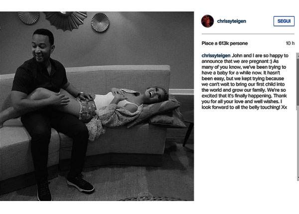 “Siamo in attesa” è l’emozionato annuncio su Instagram di John Legend che arriva poco dopo quello della moglie Chrissy Teigen: “John e io siamo così felici di annunciarvi la nostra dolce attesa. Come molti di voi sanno, abbiamo cercato di avere un bambino da un po’ di tempo. Non è stato facile, ma ce l’abbiamo fatta e non vediamo l’ora di far nascere il nostro bambino e far crescere la nostra famiglia. Siamo così eccitati che sta finalmente avvenendo”.