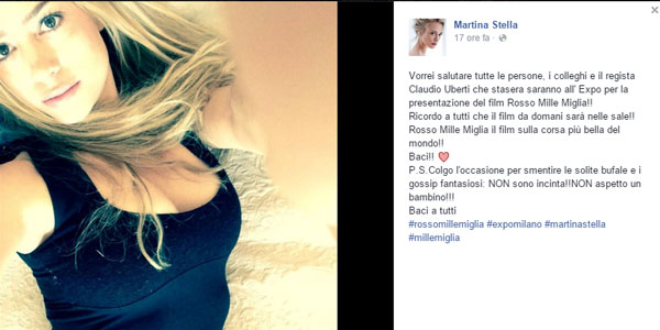 Martina Stella smentisce il gossip. Nei giorni scorsi su una rivista patinata erano apparse alcune foto sospette e si era parlato di una presunta gravidanza dell’attrice.