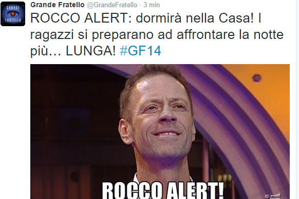 00.07 – Rocco – vestito – si trova nel caveau e dice che dovrà testare il livello di energia erotica all’interno della Casa… la Marcuzzi comunica ai ragazzi che stanotte Siffredi dormirà (dormirà???) con loro e gli lancerà una sfida. Rocco stilerà una classifica basata sulla carica erotica dei concorrenti che il prossimo giovedì verrà svelata. L’obiettivo dei ragazzi sarà quello di indovinare questa classifica: se non saranno in grado, perderanno altri 20 mila euro del montepremi finale.