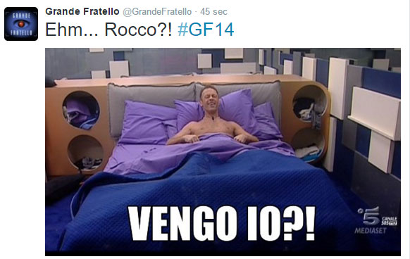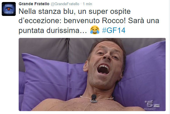 21.28 – Inizia la diretta del Grande Fratello. Rocco Siffredi è già dentro la Casa ed è già disteso a letto sotto le lenzuola “molto nudo” per sua stessa ammissione…