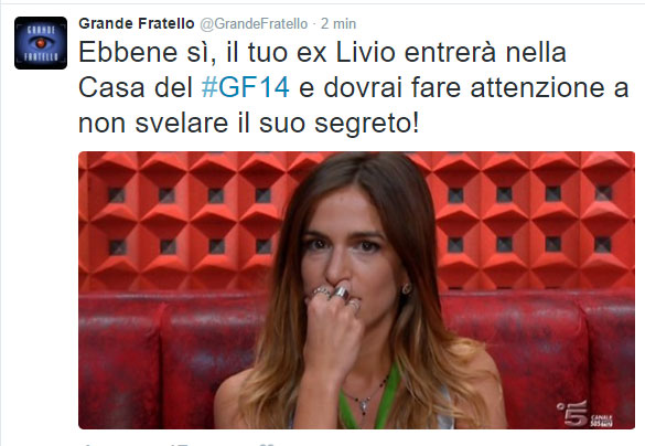 Un ingresso che ne farà vedere delle belle al Grande Fratello: è entrato nella Casa Livio, l’ex di Barbara. Il ragazzo ha dovuto dire di chiamarsi Francesco e Barbara dovrà far finta per tutta la settimana di non averlo mai visto. Una cattiveria bella e buona da parte della produzione che molto probabilmente minerà il rapporto di Barbara e Manfredi, già scosso da un brutto contraccolpo dopo l’eliminazione di Verdiana. Come reagirà Manfredi appena saprà giovedì prossimo di aver passato una settimana con l’ex della sua fidanzata? E Barbara riuscirà a mentire per sette giorni al suo nuovo amore?