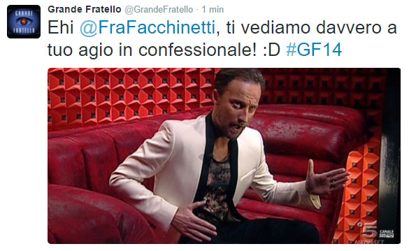 23.47 – Visto che è la serata degli ex, Francesco Facchinetti è nel confessionale: il cantante dice di amare in modo particolare il “freeze” quindi chiede di entrare nella Casa dopo che i concorrenti sono stati “freezzati”. Facchinetti è in piena promozione del suo film “Belli di papà“, parla a raffica e la Marcuzzi è costretta ad arginarlo. Poi viene “sfreezzata” Rebecca alla quale viene chiesto di cantare. Voto 4 alla sua versione de “La bambola”. Meglio non esprimere nessun voto su Facchinetti.