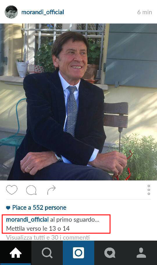 AGGIORNAMENTO: Qualche ora dopo Morandi ha risposto a Selvaggia Lucarelli: “Ciao Selvaggia! Riguardo il tuo post di oggi… io non ho mai nascosto che gestisco fb e Instagram con Anna. Ieri mi ha scattato 5 o 6 foto con il mio telefonino, sono partito per Milano di fretta poi le ho girato una delle foto, chiedendole di metterla su Instagram verso le due. Niente di speciale… Anna, nel copia incolla si è sbagliata. Comunque tu sei sveglia e attenta e hai ‘catturato’ subito! Sei forte! Ma ti confermo che per quanto riguarda Facebook e Instagram si tratta di una questione familiare e che tutti i post e i commenti ai fan sono miei senza nessun team di social manager”.