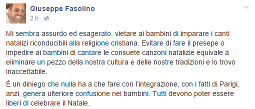 Mi sembra assurdo ed esagerato, vietare ai bambini di imparare i canti natalizi riconducibili alla religione cristiana. Evitare di fare il presepe o impedire ai bambini di cantare le consuete canzoni natalizie equivale a eliminare un pezzo della nostra cultura e delle nostre tradizioni e lo trovo inaccettabile. È un diniego che nulla ha a che fare con l’integrazione, con i fatti di Parigi, anzi, genera ulteriore confusione nei bambini. Tutti devono poter essere liberi di celebrare il Natale.