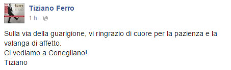 Paura passata per i fan di Tiziano Ferro. Il cantante ha scelto ancora una volta la sua pagina Facebook per rassicurare i suoi fan e dire che sta meglio.