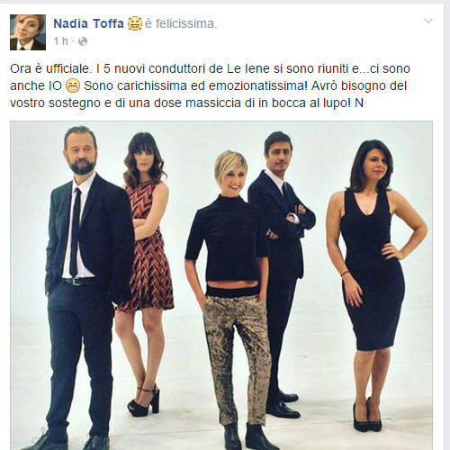 Si tratta di Geppi Cucciari, Miriam Leone, Nadia Toffa, Pif e Fabio Volo. Un quintetto inedito unito – tranne per la Toffa – da un manager comune: Beppe Caschetto.