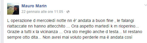 “L’operazione d mercoledì notte nn è andata a buon fine, le falangi riattaccate nn hanno attecchito … Ora aspetto martedì k m rioperino… Grazie a tutti x la vicinanza … Ora sto meglio anche d testa… M restano sempre otto dita… Non avrei mai voluto perderle ma è andata così”