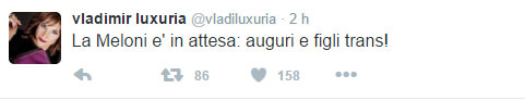 Subito su Twitter si sono scatenati i commenti dopo l’annuncio della Meloni. E anche Vladimir Luxuria le ha voluto fare i suoi auguri cinguettando: “Auguri e figli trans!”.