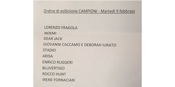 Oggi invece ha reso nota la scaletta della serata di stasera: Lorenzo Fragola, Noemi, Dear Jack, Giovanni Caccamo e Deborah Iurato, gli Stadio, Arisa, Enrico Ruggeri, i Bluvertigo, Rocco Hunt e Irene Fornaciari.