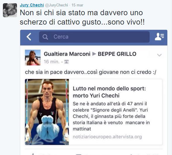 “Se ne è andato all’età di 47 anni il celebre “Signore degli Anelli”. Yuri Chechi, il ginnasta più forte della storia Italiana è venuto mancare in mattinata in seguito ad un malore improvviso che lo ha colto nella sua casa di Roma”, si legge tra le righe dell’articolo. Immediata la risposta dello sportivo che ha subito pubblicato un tweet: “Non so chi sia stato ma davvero uno scherzo di cattivo gusto…sono vivo!!“.