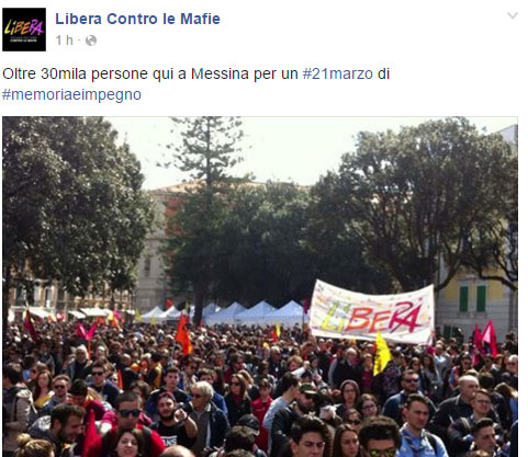 A Messina e, in contemporanea in 1.000 luoghi in tutta Italia, il 21 marzo si celebra la XXI Giornata della Memoria e dell’Impegno in ricordo delle vittime innocenti delle mafie, promossa da Libera e Avviso Pubblico, in collaborazione con la Rai Segretariato Sociale e Rapporti con il pubblico e con il patrocinio del Comune di Messina e sotto l’Alto Patronato del Presidente della Repubblica.