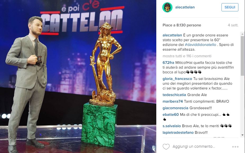 Saranno consegnati questa sera i David di Donatello, ovvero gli Oscar italiani del cinema. La premiazione sarà trasmessa in diretta su Sky cinema 1, Sky Uno, Sky Cinema e su Tv8 e la conduzione verrà affidata ad Alessandro Cattelan. A consegnare le statuette anche Cristian De Sica, Michele Placido, Toni Servillo, Stefano Accorsi, Giuseppe Battiston, Paola Cortellesi, Saverio Costanzo, Matilde De Angelis e Giuliano Sangiorgi.