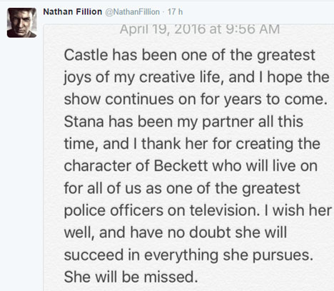 La conferma di questi rumors arriva da Variety che riporta che la decisione è stata presa dalla ABC riportando anche le dichiarazioni della dirigenza dell’emittente televisiva: “Kate Beckett è stato uno dei personaggi più amati di questa serie per otto anni. Siamo grati a Stana Katic per il suo talento e per il suo impegno. Speriamo di continuare il nostro rapporto”.