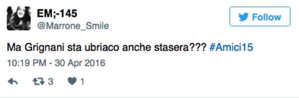 Anche stavolta Grignani ha fatto lo show. Il cantante è stato ospite della scorsa puntata di Amici 15, duettando con Chiara Grispo, concorrente della Squadra Blu. Dopo lo strano duetto, dove Chiara ha tentato di stare al passo del cantautore, Grignani si è scusato per la performance imbarazzante.