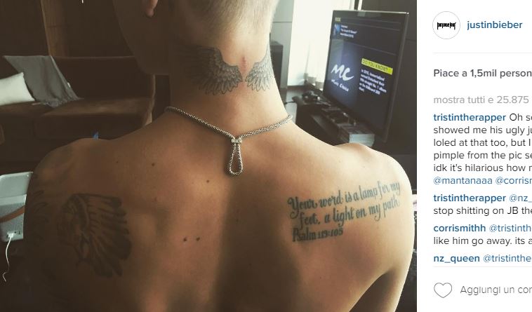 Si tratta quindi dell’ennesimo simbolo religioso, per Justin. Il cantante aveva già impresso sulla sua pelle due mani congiunte in preghiera, un crocifisso avvolto in una corona di spine grondante di sangue, la parola “forgive“, il versetto 119 della Bibbia, aggiungendo alla lunga lista una piccola croce. Cosa ci si dovrà aspettare ora?