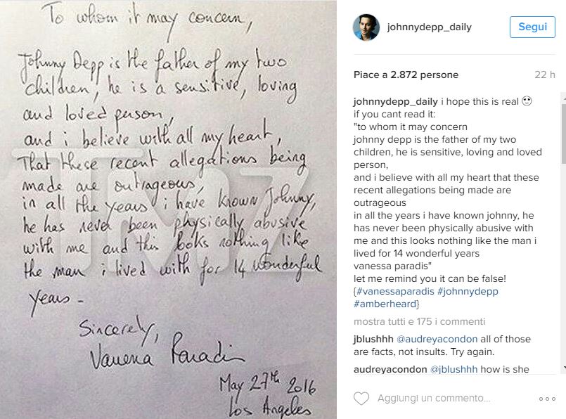 “Johnny Depp è il padre dei miei due figli, è una persona sensibile, affettuosa e molto amata – ha scritto su Instagram Vanessa Paradis, storica partner di Depp – E io credo con tutto il mio cuore che queste recenti accuse che gli vengono fatte sono oltraggiose. In tutti questi anni, da quando conosco Johnny, non è mai stato fisicamente violento nei miei confronti. Quello di cui si parla non sembra affatto lo stesso con cui ho vissuto per 14 meravigliosi anni”.