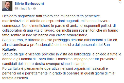 Le “rassicurazioni” sono arrivate anche per lo scenario politico nel passaggio finale dove Berlusconi ha tenuto a precisare che “Forza Italia è pienamente operativa” ed è “perfettamente in grado di operare in questi giorni di mia forzata assenza”.
