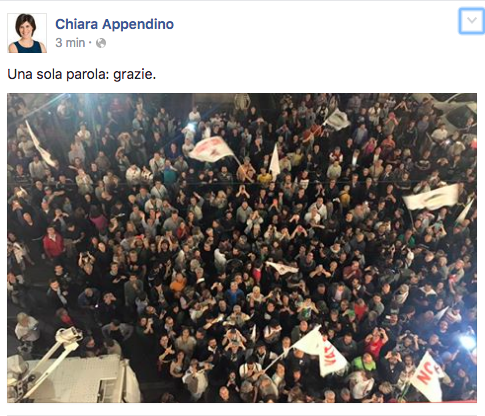 Ore 01.05 – Chiara Appendino, nuovo sindaco di Torino, ha ringraziato così tutti gli elettori del M5S: