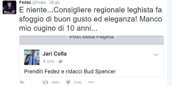 Sta di fatto che l’ultimo in ordine di tempo a prendersela con il rapper è stato il consigliere Leghista Jari Colla che, dopo la notizia della morte di Bud Spencer ha scritto su Facebook: “Prenditi Fedez e ridacci Bud Spencer”.
