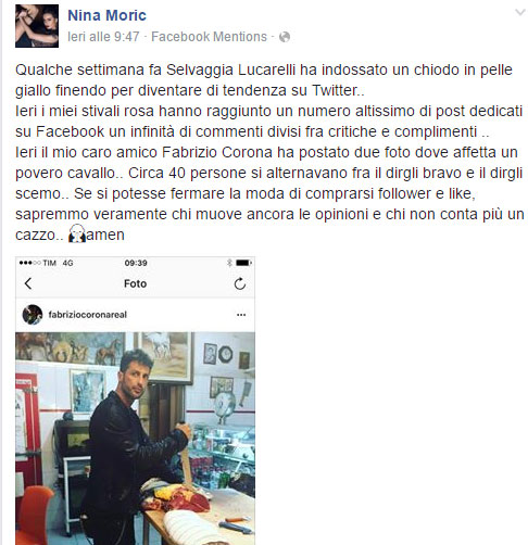 Fabrizio Corona ha pubblicato su Instagram alcune foto mentre a Catania taglia della carne di cavallo. Molte sono state le reazioni sui social e anche Nina Moric, sua ex moglie, ha voluto commentare pubblicando sulla propria pagina Facebook la foto di Corona scrivendo: