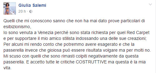 Io sono venuta a Venezia perché sono stata richiesta per quel Red Carpet e per supportare il mio amico stilista indossando una delle sue creazioni; Per alcuni mi rendo conto che potremmo avere esagerato e che la passerella invece che gioiosa può essere risultata volgare ma per molti no. Mi scuso con quelli che sono rimasti colpiti negativamente da questa passerella. E accetto tutte le critiche COSTRUTTIVE ma questa è la mia vita.