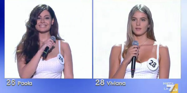 23.34 – Prossime due a sfidarsi sono la n.26 Paola Torrente e la n.28 Viviana Vogliacco. Il confronto viene vinto da Paola, per Viviana Miss Italia finisce qui.