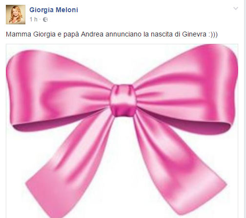 L’annuncio arriva con un bel fiocco rosa direttamente sui profili social del leader di Fratelli d’Italia:
